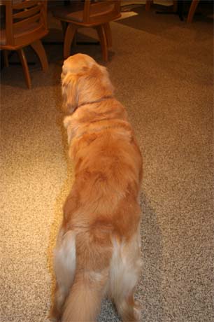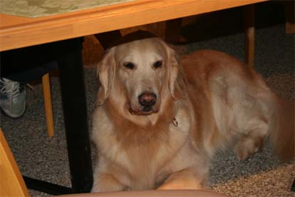 ママ達が食事をしている間テーブルに下でおりこうさんに待っているメグ
