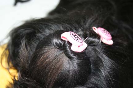 「こうやって結ぶと 前に落ちてこないし可愛いですよ」とトリマーのセイコちゃんが教えてくれましたが・・・・・・・・ 「何度かやれば出来ますよ」と言われても・・・